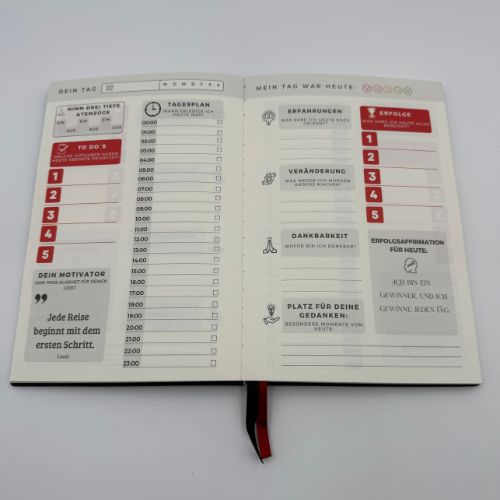 Geliefert in einer edlen Box mit hochwertigem Kunstleder-Cover, zwei Lesebändern und passendem Kugelschreiber. Für drei Monate begleitet Dich dieses exklusive Journal täglich – klar strukturiert, übersichtlich und mit dem Anspruch, Dir genau das zu geben, was Du verdienst: das Beste.